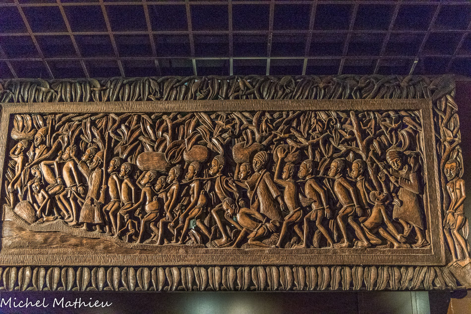 Panneau sculpté en bas-relief et ajouré, représentant une colonne d'esclaves encadrés par des négriers arabes. On estime que cette traite à concerner environ 17 millions d'Africains entre 650 et 1920.