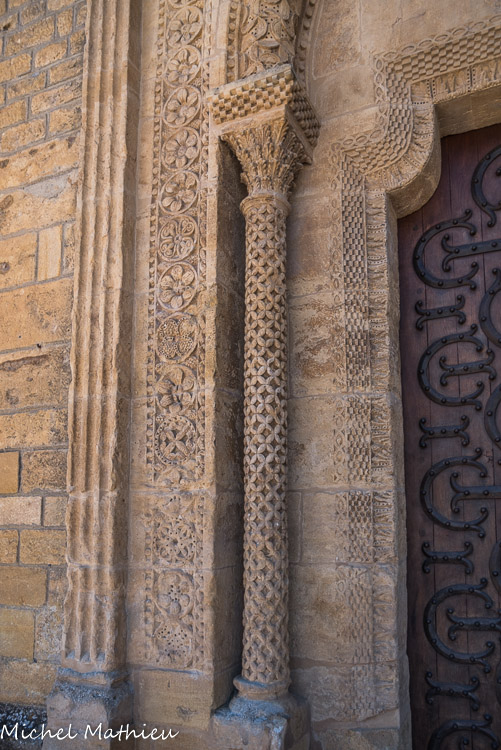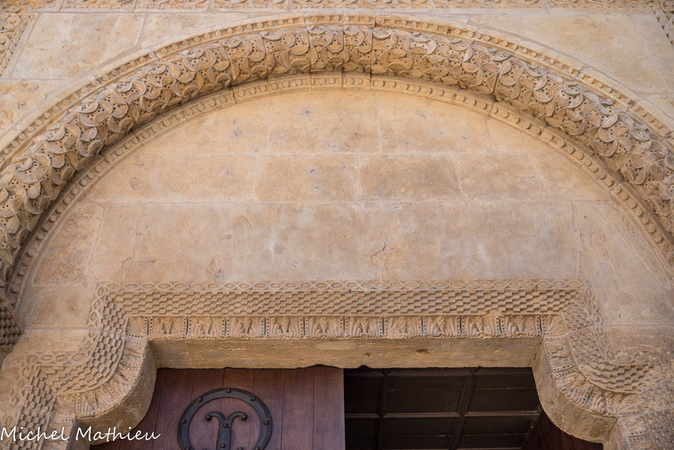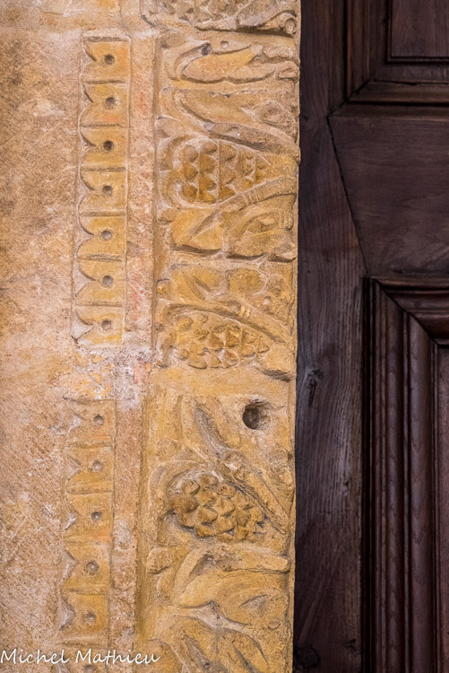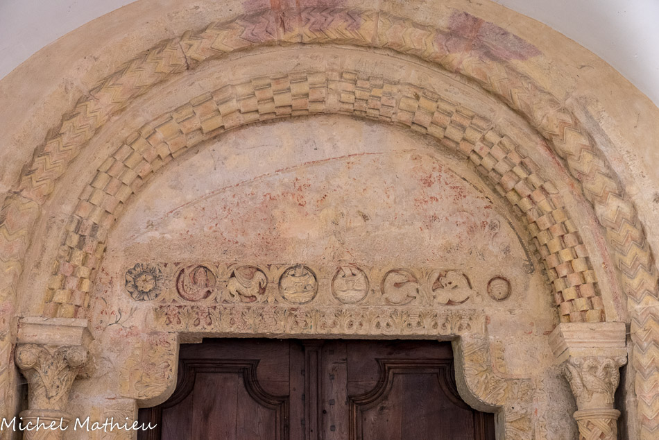 Le linteau aux motifs végétaux et zoomorphes est particulièrement original : ses huit médaillons représentent une rosace fleurie, un animal ailé, un quadrupède ailé à tête d’oiseau, deux gorgones renversés tirant la langue, deux autres quadrupèdes et une tête de singe. On y retrouve les piédroits et voussures décorées de rubans plissés, de chevrons brisés, d’entrelacs, de billettes et de vannerie.