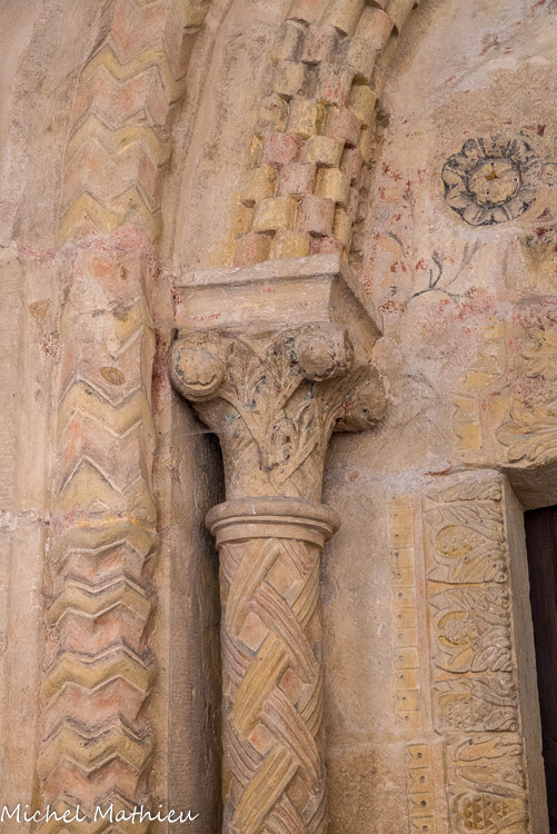 Le décor sculpté des colonnes et des voussures du portail est très riche : on y admire des feuillages, des hélices, des guirlandes, des billettes en damier, des feuilles d’acanthe et des perles. LChapiteau sculpté de branches raides.