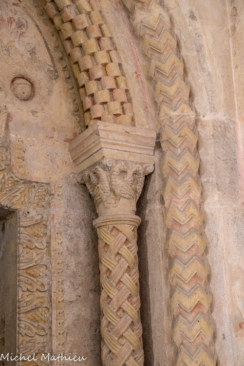 Frises de rosaces en plat-relief entre des rangs de perles et de besants. Le décor sculpté des voussures du portail est très riche : on y admire des feuillages, des hélices, des guirlandes, des billettes en damier, des feuilles d’acanthe et des perles.