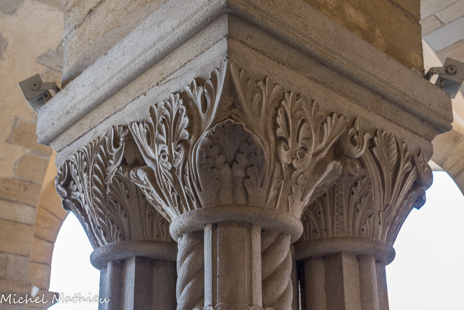 Chapiteau sculpté d’ornements végétaux, piliers à entrelacs.