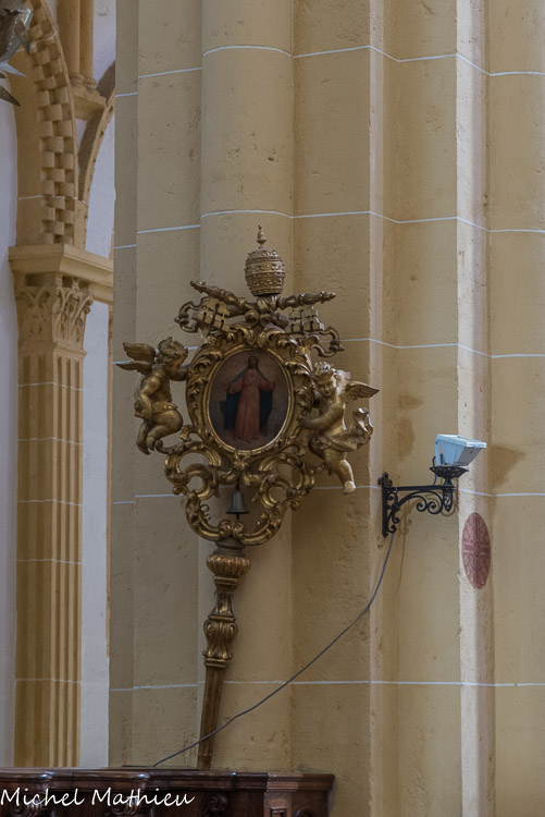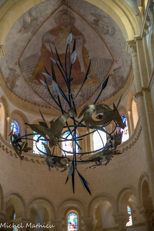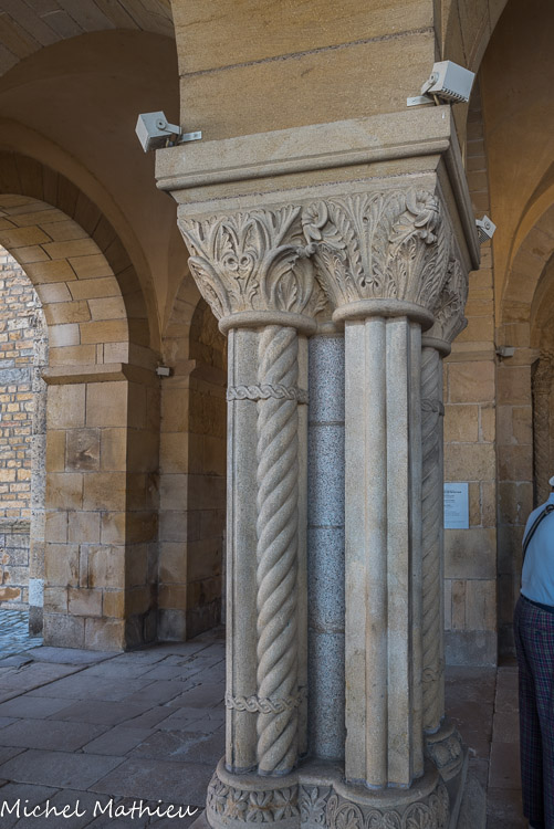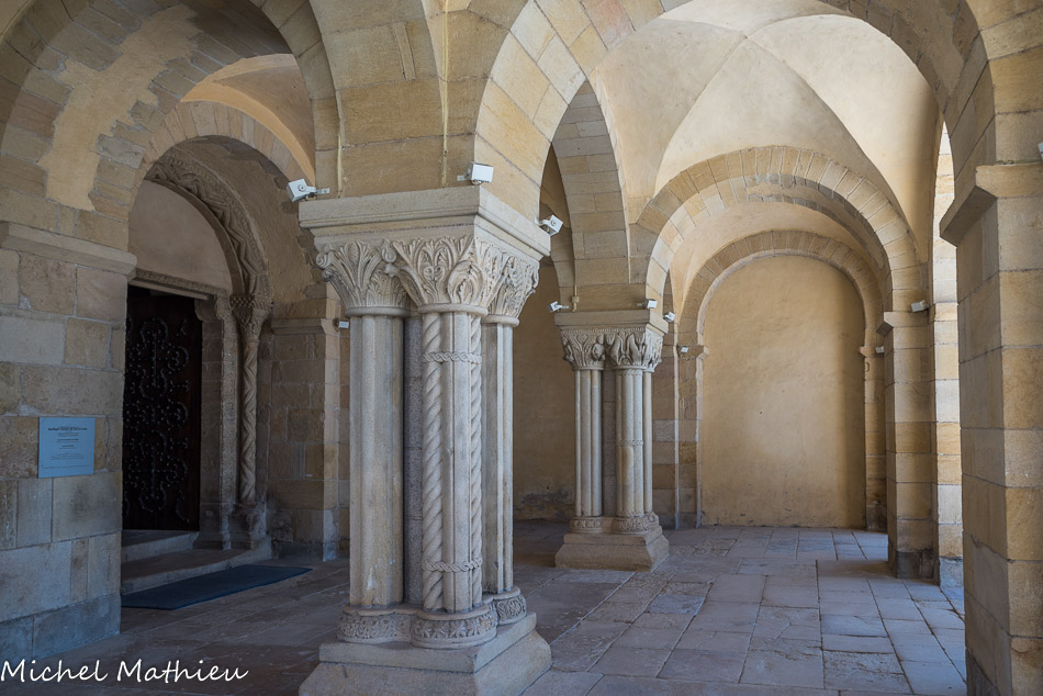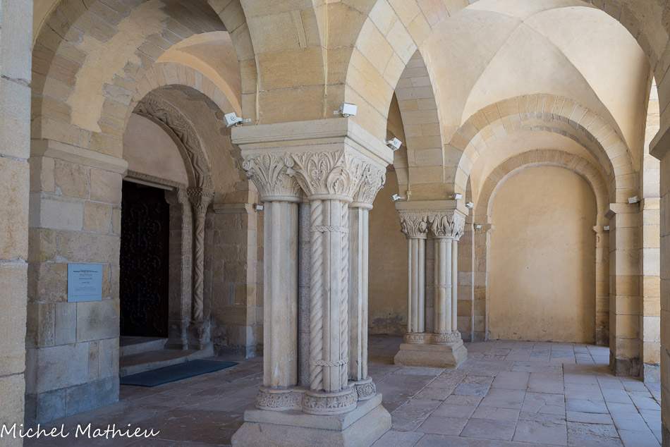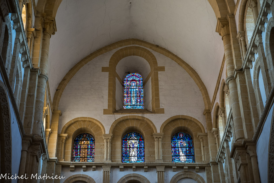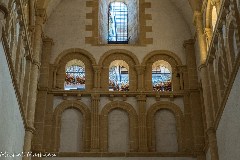 Mur Ouest de la nef. La baie axiale de la chapelle Saint-Michel, donnant une vue magnifique sur la grande nef, est du 12e siècle. Cette baie, flanquée de colonnettes, ne se trouve pas au centre, ce qui montre les raccords difficiles de la nef avec le narthex plus ancien, dont l’axe est légèrement différent.
