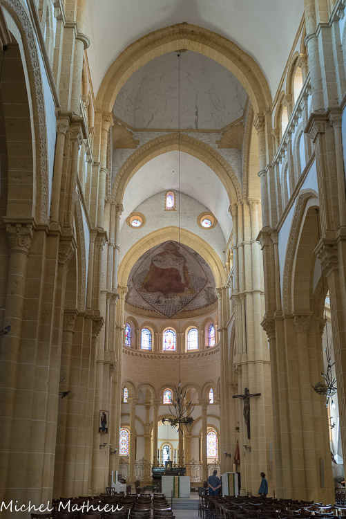L’abside se compose de neuf arcatures décorées d’oves sur de hautes colonnes monolithes, surmontées d’une série de fenêtres hautes. Une corniche à petites arcatures souligne les fenêtres hautes décorées d’arcatures à billettes en damier et de colonnettes doubles.
