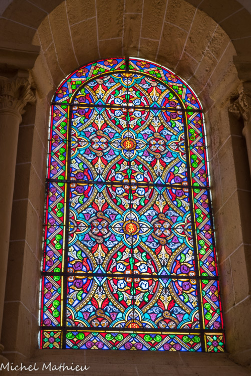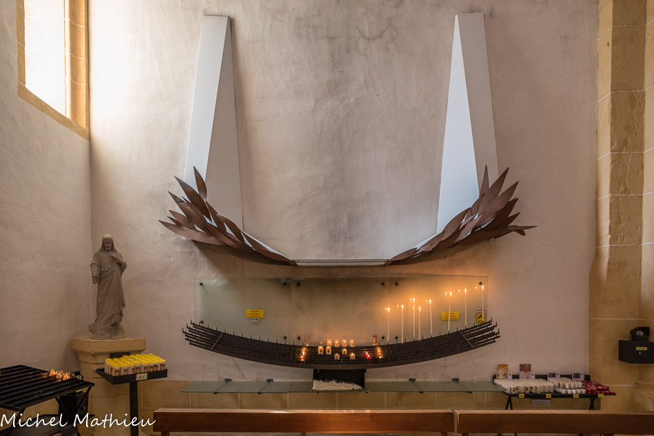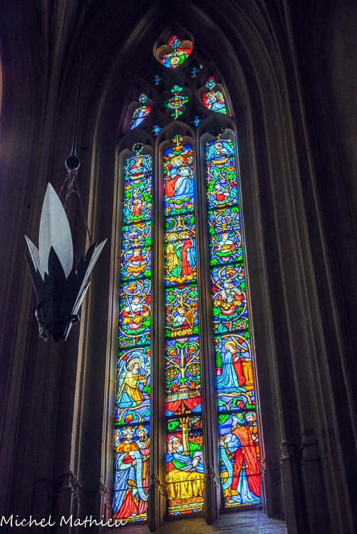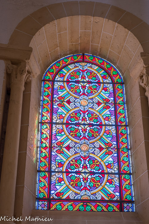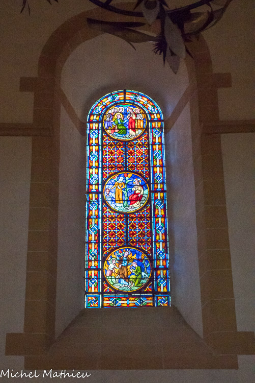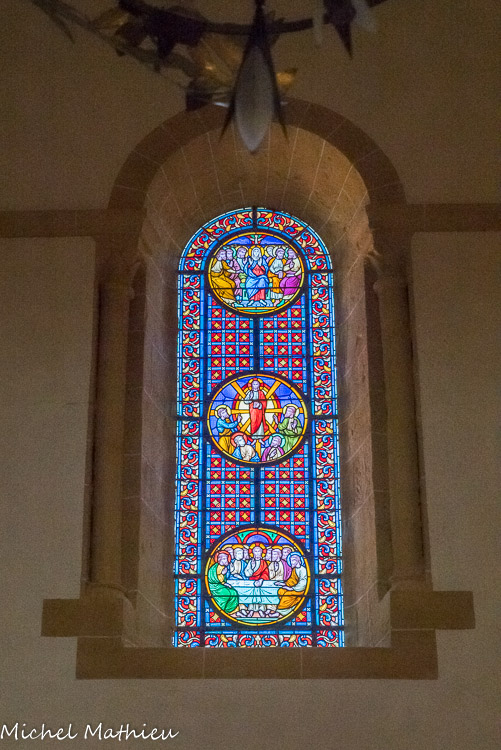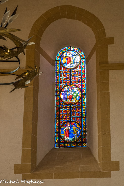 Mur pignon du croisillon. Les vitraux de facture plus contemporaine qui ornent les transepts ont été réalisés en 1986 par André Ropion, évoquant la terre et la mer, comme dans les évangiles.
