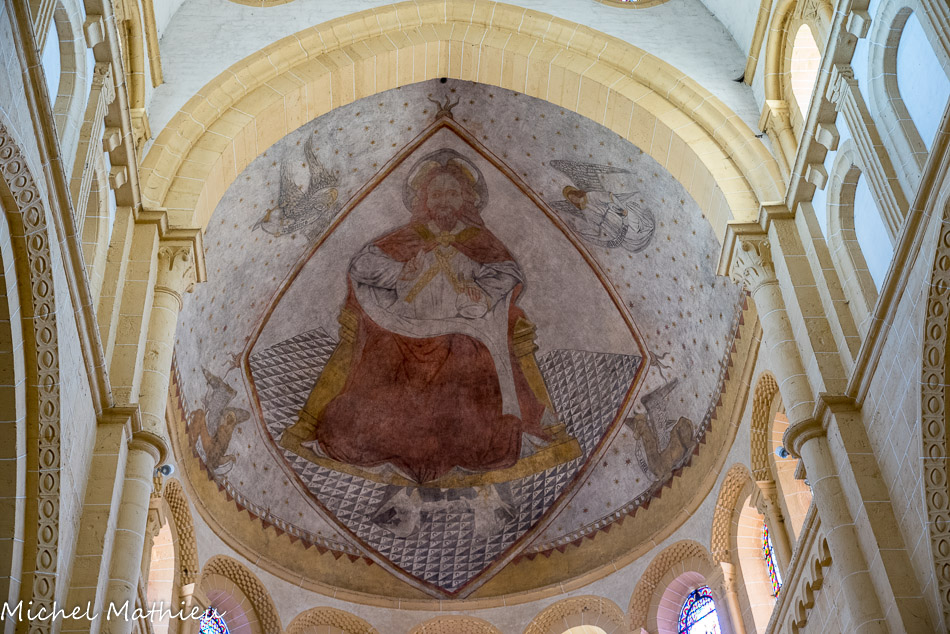 La fresque du 15e siècle du Christ en majesté dans le cul-de-four de l’abside, bénissant de la main droite et tenant dans la main gauche le monde, entre les symboles des Evangélistes. Elle fut redécouverte et restaurée en 1935.