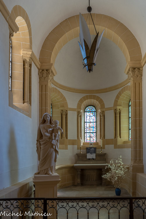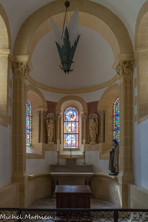 Les chapelles rayonnantes sont dédiées à St-Joseph (centre, ici), à St-Blaise (nord) et à Ste-Thérèse (sud). Elles se composent d’une travée droite en berceau (qui n’existait pas à Cluny), d’un arc en plein cintre sur deux pilastres cannelés avec chapiteaux, et d’une petite abside en cul-de-four avec trois baies à colonnettes.