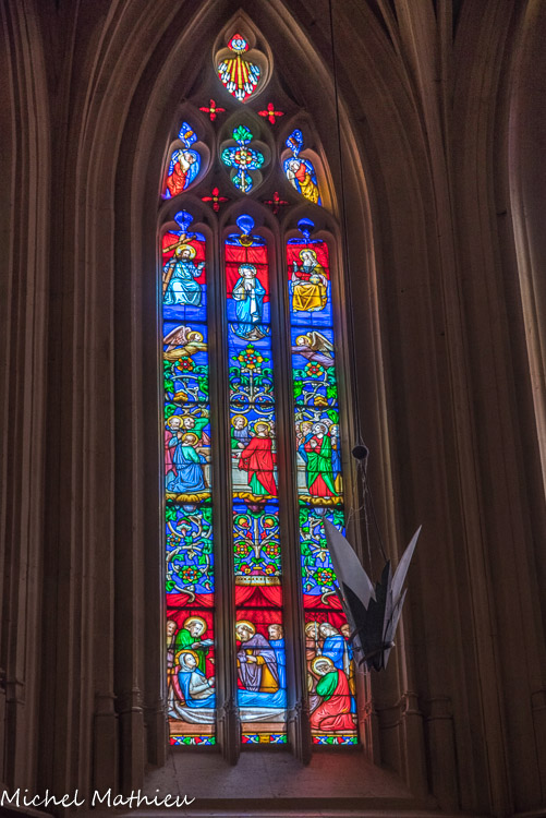 Mur Ouest de la nef. Les vitraux ont été exécutés pour la plupart au XIXe siècle par les maîtres verriers Bégulle, Gaudin, Lorin ou bien Thibault. En haut, St Hugon. En bas, St François, St Bernard et St Dominique.