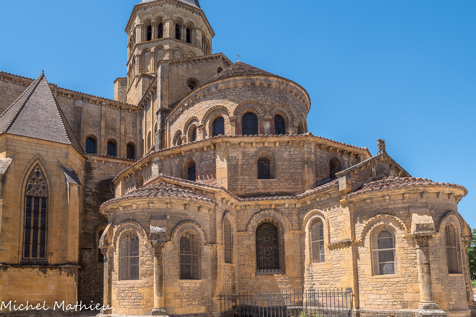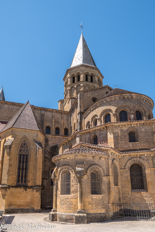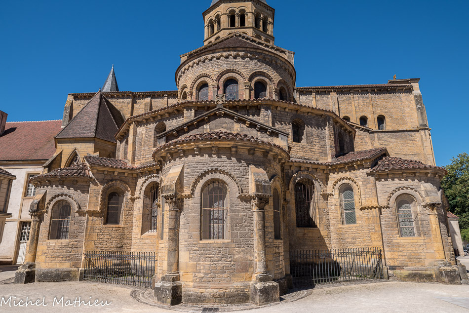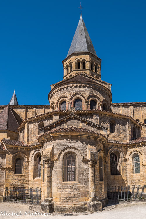 Le chevet est l’un des plus réussis du monde roman, avec son étagement de baies, d’arcatures et de toitures, bien que le clocher qui le surmonte ait été reconstruit au milieu du 19e siècle quand l’église fut restaurée par Millet. A l'image de cet édifice clunisien, les bâtisseurs de Paray-le-Monial reprirent le chevet à déambulatoire. Les volumes intérieurs se laissent deviner : absidioles des chapelles qui s'ouvrent sur le déambulatoire, entourant le chœur liturgique, siège de l'autel majeur. De droite à gauche : la porte Nord, la chapelle des fonts baptismaux qui fait partie du transept et qui est accolée à la travée du choeur, les absidioles des chapelles de St Blaise etde St Joseph (la centrale).