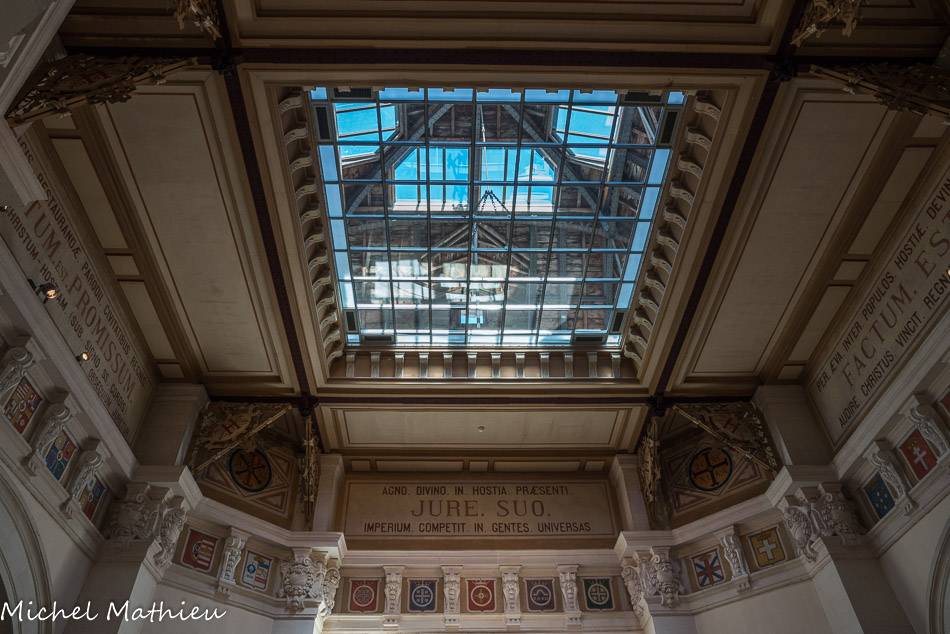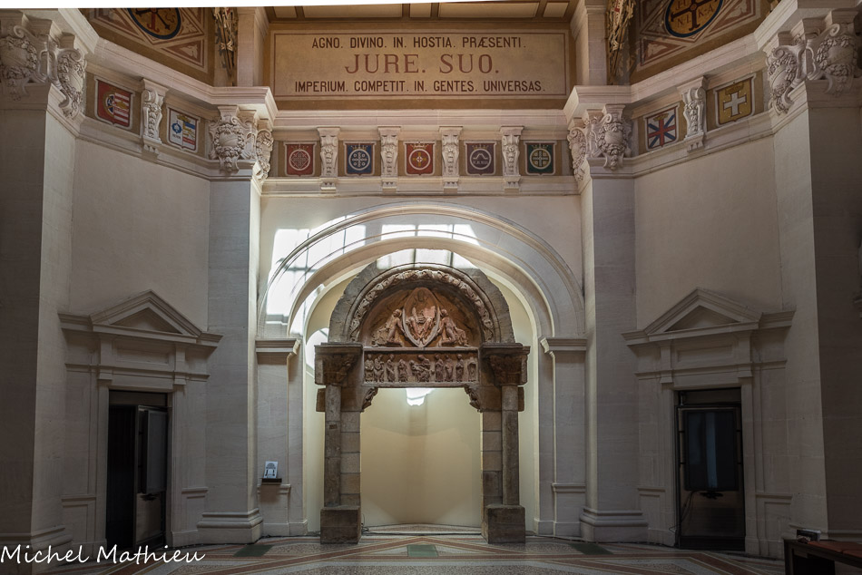 Le musée du Hiéron. Agno Divino in Hostia praesenti /JURE SUO / Imperium competit in gentes uni : « A l'Agneau Divin présent dans l'Hostie / DE DROIT / appartient l'empire sur toutes les nations » Cette inscription renvoie à la muséographie d'origine. La première galerie était alors dénommée « Salle du Droit ». Elle montrait le droit donné au Christ de régner sur terre par l’institution de l'Eucharistie. Les cartouches gravés en latin sur les pilastres présentent les "preuves de ce droit” : l’Écriture Sainte (Sacra Scriptura), la Tradition chrétienne (Traditio Christiana), les Saints Docteurs (SS. Doctores), le Magistère de l'Église (Ecclesia Magisterium). Les écussons représentent les cinq principaux rites eucharistiques "déterminant les cinq principales liturgies" : le grec, le latin, le syro-chaldéen, le mozarabe.