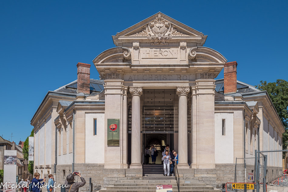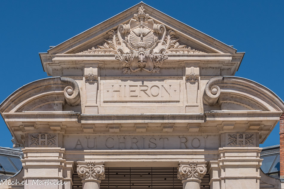Le musée du Hiéron. La façade monumentale est marquée d'une iconographie chrétienne : le fronton présente parmi un ensemble de symboles, la tiare papale à la clef de voûte at la colombe de l'Esprit-Saint en son centre. Quant aux chapiteaux d'influence corinthienne, ils portent le chrisme du Christ, formé par l'imbrication de ses deux premières lettres grecques “chi” et “rhô".
