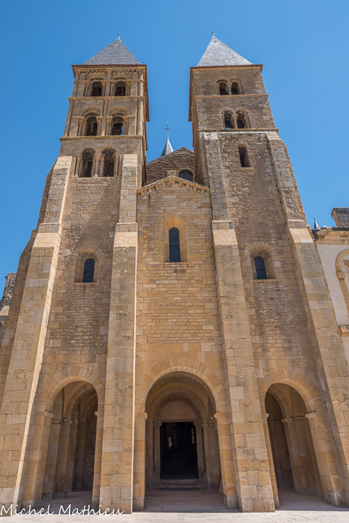 Le clocher sud est encore de la fin du 11e siècle et possède deux étages supérieurs aux baies géminées de petite ampleur avec doubles colonnettes et chapiteaux frustes. Les trois étages supérieurs du clocher nord sont du début du 12e siècle et ses doubles baies sont richement décorées dans le style du Brionnais : colonnettes torsadées, demi-colonnes, corniches, arcatures, tailloirs à billettes et des chapiteaux fantastiques. L’étage supérieur du narthex, ou chapelle Saint-Michel, est accessible depuis la nef par un escalier étroit. Elle servait aux offices pour les morts des moines clunisiens.