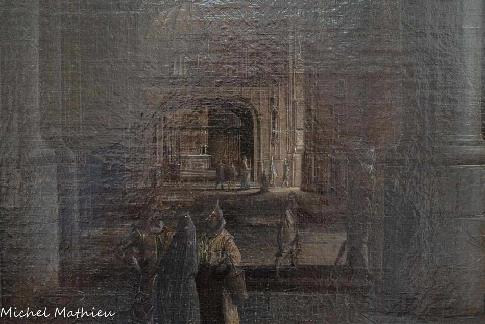 Intérieur d'église. Henri van Steinwick le Jeune (1580-1649). Signé et daté, 1623. Huile sur toile. La partie éclairée attire d'abord le regard vers le prêtre qui officie face à l'autel, pratique en vigueur jusqu'au concile Vatican II (1962-1965). L'atmosphère contrastée, entre espaces lumineux et zones d'ombres, témoigne de la virtuosité du peintre.