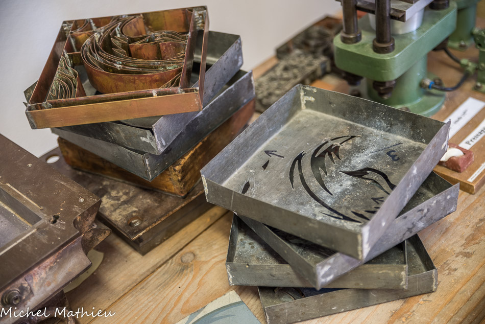 Les pochoirs. Le réseau en laiton talqué était placé au fond du moule.
