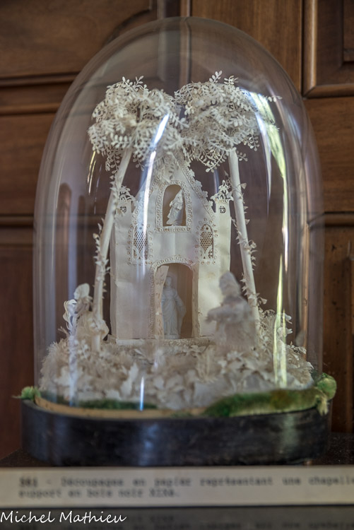 Découpages en papier représentant une chapelle, sur un support en bois. XIXe siècle.