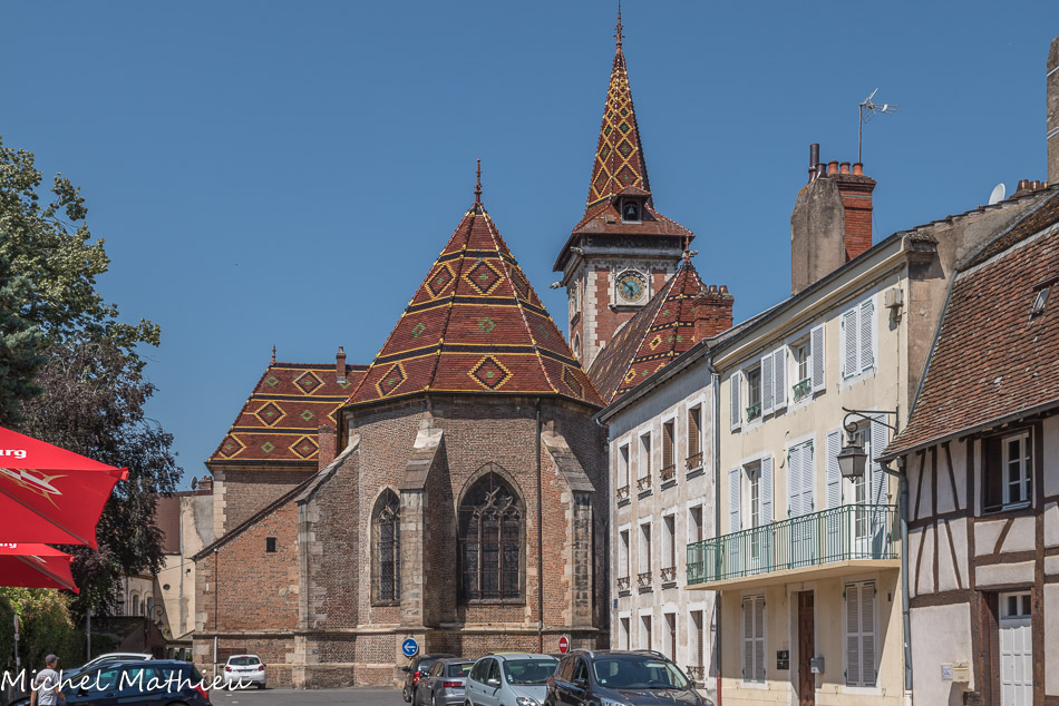L'édifice est principalement constitué de briques avec contreforts de pierre et de briques. La couverture en tuile vernissées polychrome de Bourgogne donne une unité remarquable au bâtiment.