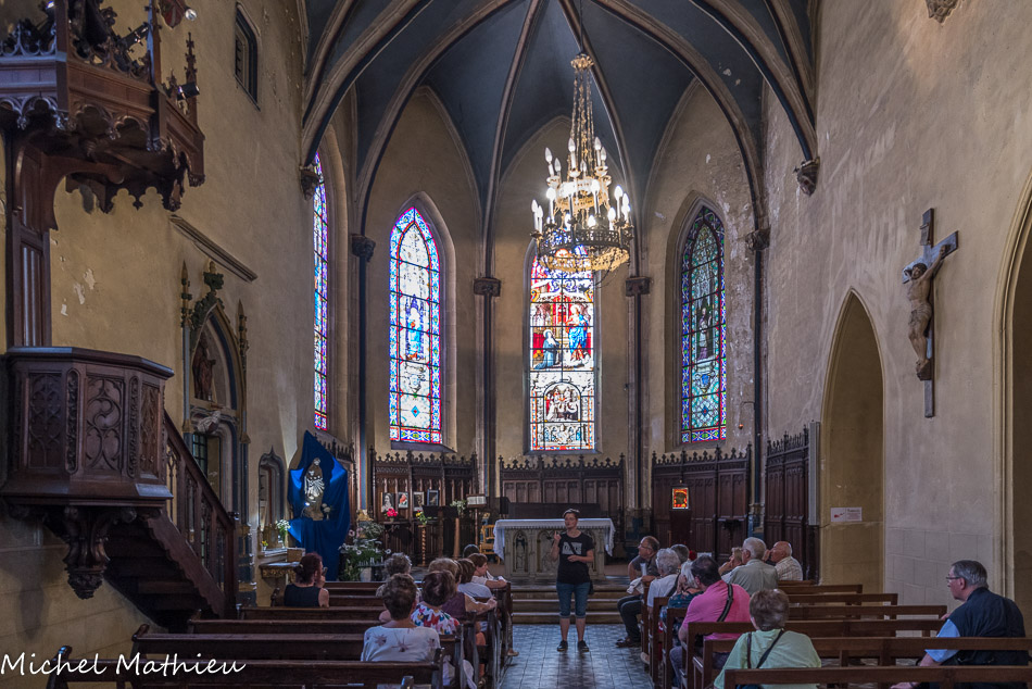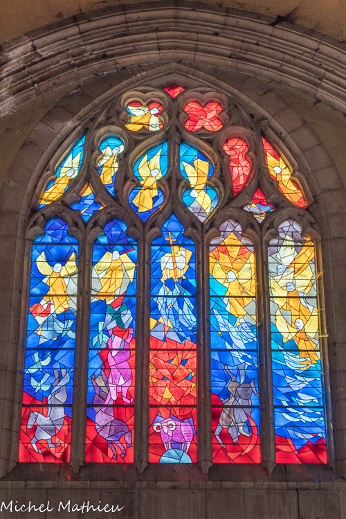 Dans les trois travées des bas-côtés, sur les vitraux bleus et rouges, sont représentés le chrisme et l'agneau (symboles du Christ), des colombes s'abreuvant (symbole des disciples du Christ) et des animaux figurés.