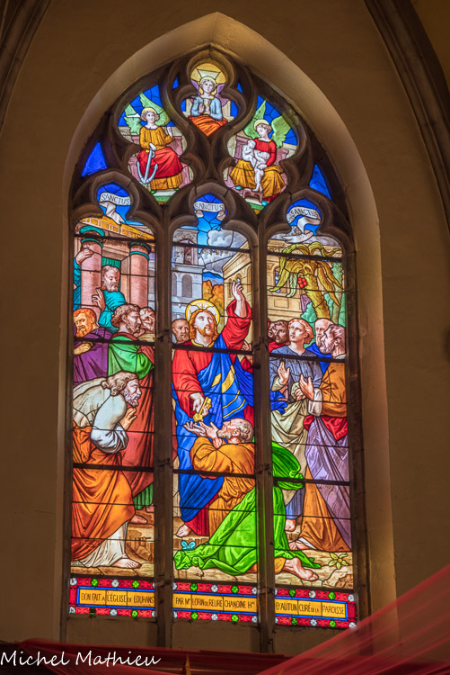 Dans le chœur, le vitrail montre la remise des clefs à saint Pierre, saint patron de l'église. Le Christ, bras gauche et yeux levés vers le ciel symbolisant le lien avec le Père, remet à Pierre, à genoux, les clefs du Royaume devant tous les apôtres réunis. En haut, des anges présentent les symboles de la Foi (le ciboire), de l'Espérance (l'ancre) et de la Charité (l'accueil des enfants orphelins).