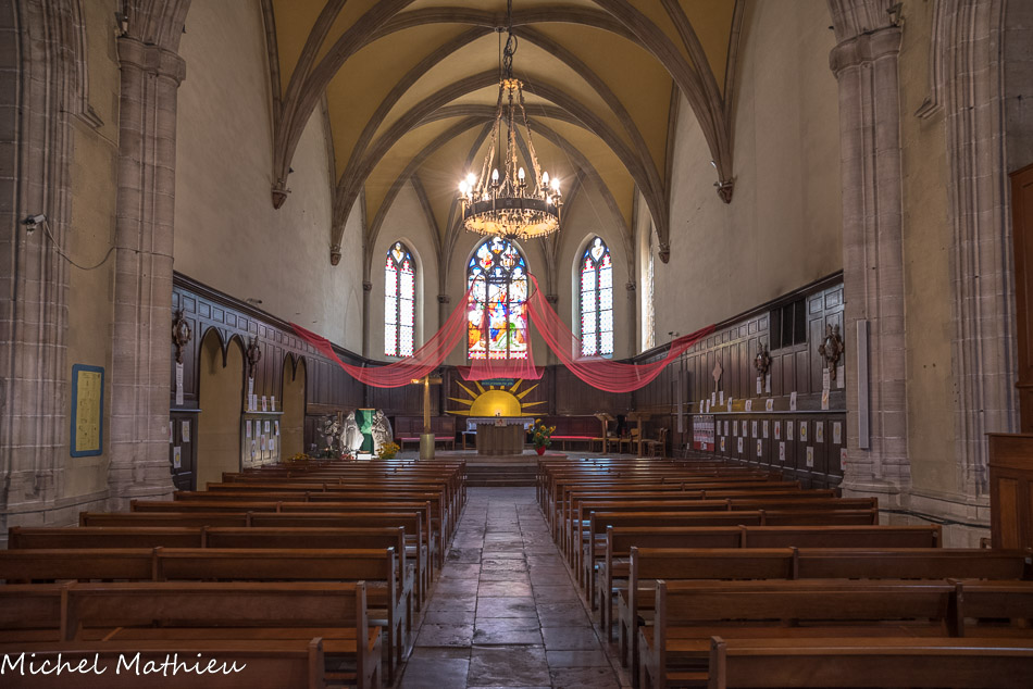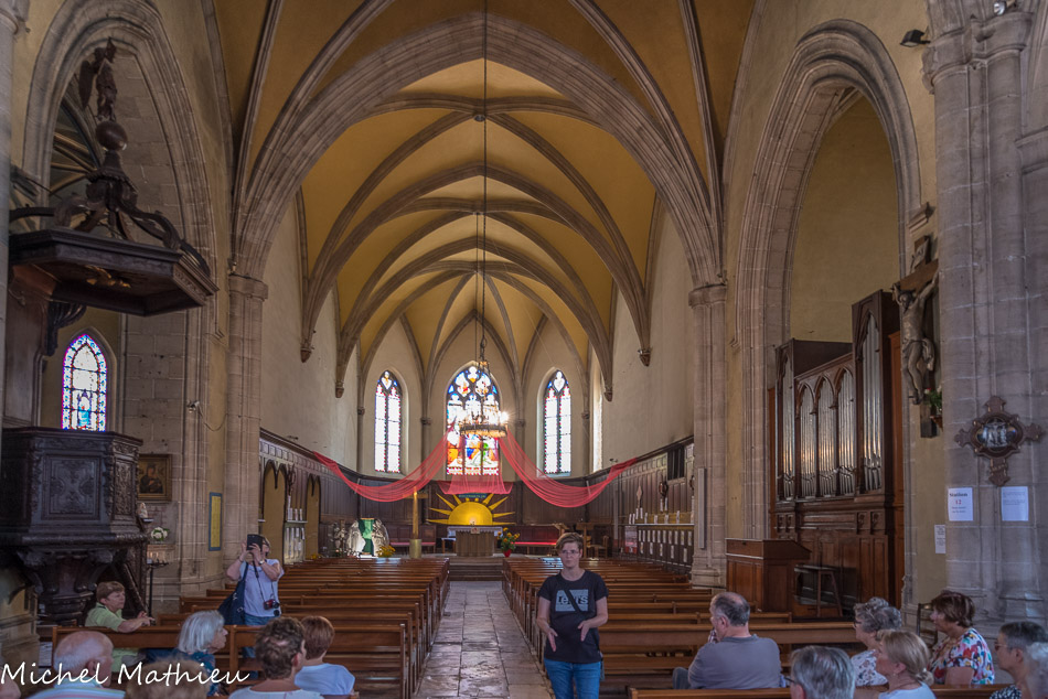 La grande nef. Le chœur est prolongé par une nef où sont aménagées plusieurs chapelles latérales.