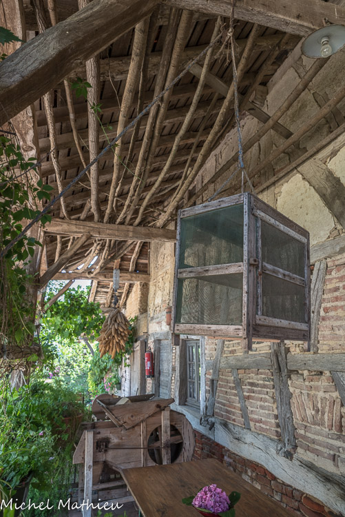 L’entrée de l’habitat avec une avancée du toit, ombragée par un préau de vigne vierge avec sur la droite les escaliers en chêne massif permettant l’accès au grenier pour monter des sacs de blé à dos d’hommes, aujourd’hui utilisé pour accéder aux trois chambres d’hôtes.