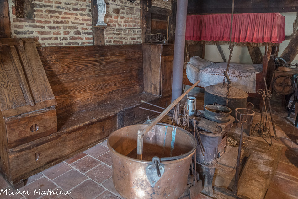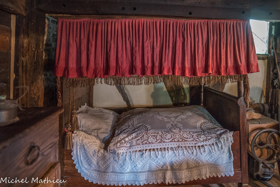 l’archebanc ( banc des ancêtres) et le lit à baldaquin aux abords du foyer,