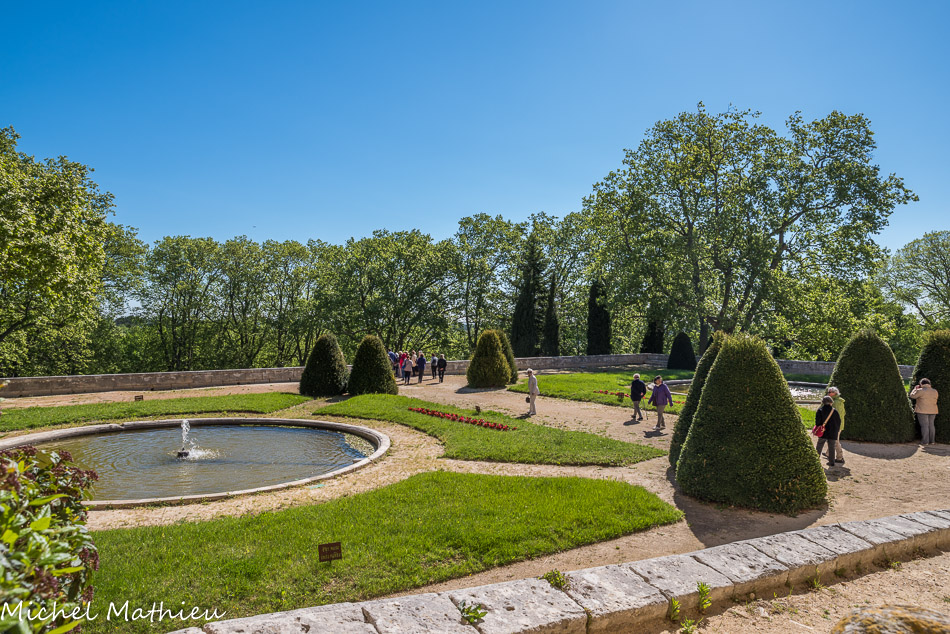 De la cour d’honneur, on accède aux grandes terrasses offrant une superbe vue sur les allées en forme d’étoile, les bassins et un paysage de vignobles.