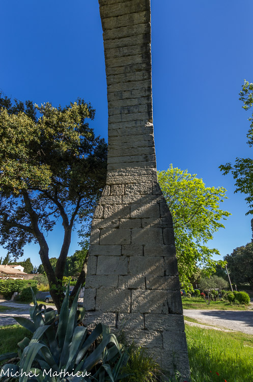L'aqueduc. Il a une longueur totale de 6822 mètres pour un dénivelé de 3 mètres, soit une pente moyenne de 0, 447 mètre par kilomètre. Le trajet choisi fut donc celui de la courbe de niveau, même si elle allongeait beaucoup la longueur de l'aqueduc. Cela évitait d'avoir à construire un aqueduc entièrement supporté par des arcades. Il semblerait que pour éviter un courant d'eau trop rapide qui aurait rapidement érodé la pierre tendre de Castries utilisée pour construire la conduite, la rigole fut construite en escalier hydraulique, c'est-à-dire en plusieurs sections de très faible pente se terminant sur un puits carré qui servait d'escalier mais aussi, grâce au tourbillon causé, à faire précipiter le carbonate de calcium contenu dans l'eau qui se déposait au fond du puits avec toutes sortes d'impuretés au lieu de finir, par ses dépôts, par diminuer la section du conduit au bout de plusieurs années.