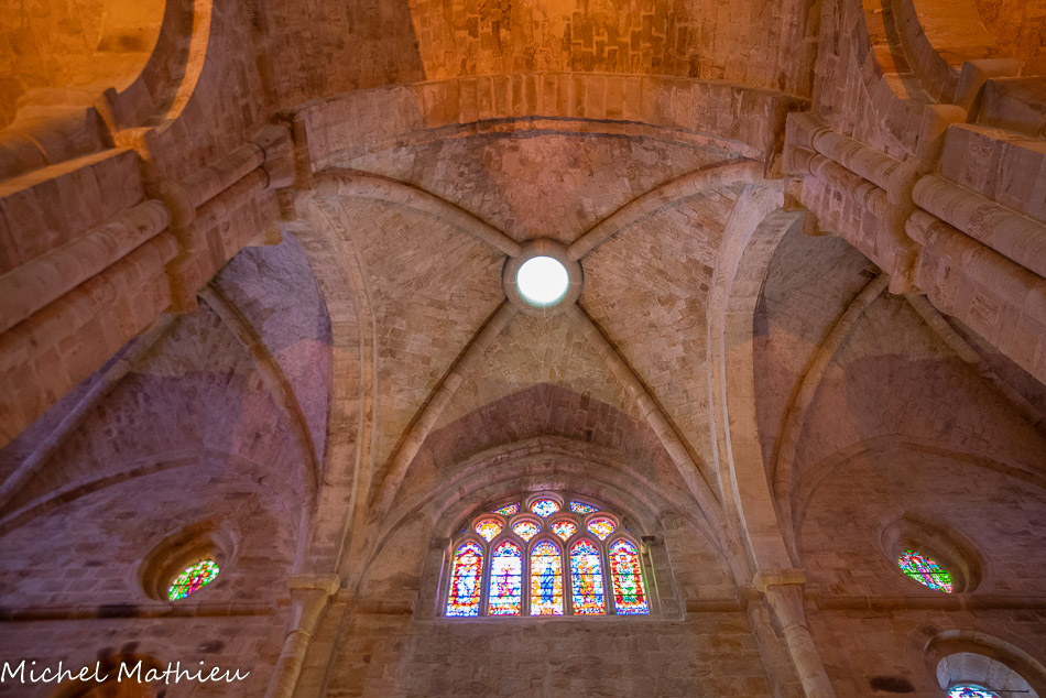 Le cloître. Tout au long de la galerie existent des bancs où les moines venaient s’asseoir soit pour lire individuellement, soit pour se reposer en méditant ce que leur mémoire et leur cœur avaient retenu de la liturgie ou de la lecture. La croisée d’ogives y est accompagnée d’un lierre longitudinal torique et les compartiments très bombés sont appareillés en lit concentrique.