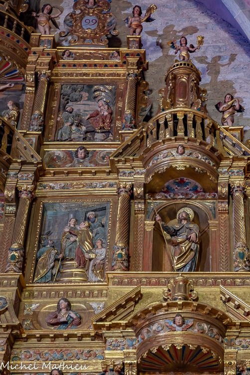 Deuxième et troisième registres. Saint Jacques le Majeur, au bourdon et à la calebasse du pèlerin, la remise des clés du royaume des cieux, et Saint Paul, avec l'épée qui l'a décapité. Saint Barthélémy a perdu dans la main gauche le coutelas l'ayant écorché vif, a libération de Pierre, et Saint Jacques le Mineur, à la massue de foulon qui l'acheva. Entre deux anges tenant une trompette, Saint Grégoire le Grand.