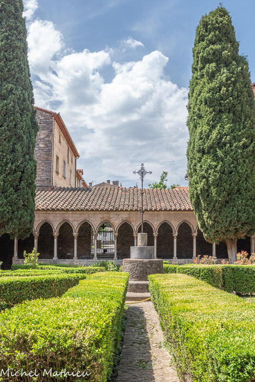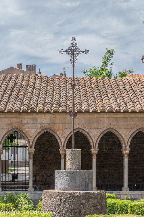 Le cloitre. Il se compose d'une galerie couverte d'un toit en appentis avec charpente apparente et, aux quatre angles, s'appuient les murs des anciens bâtiments claustraux devenus propriétés particulières. L'arcature du cloître, celle de la salle capitulaire et les arcs établis aux quatre angles sont de marbre blanc ; les autres murs sont en galets de mortier.