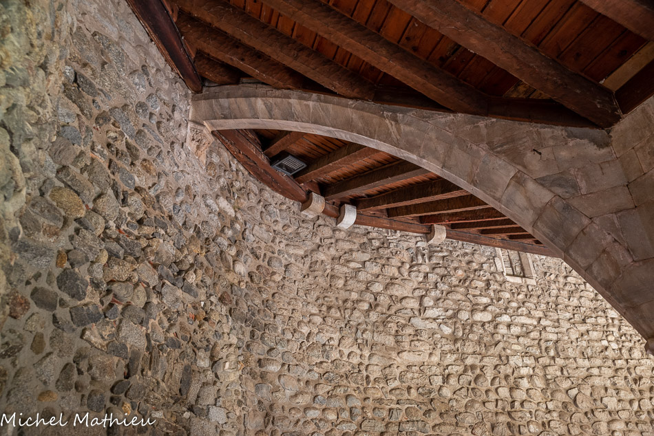 Les collatéraux sont couverts en plein cintre. Au fond, la contre abside : Intérieurement, le mur de façade reçoit trois absides. Il s'agit d'un mode architectural carolingien, plus fréquent en pays Mosan et Rhénan, miraculeusement parvenu intact jusqu'à nous.