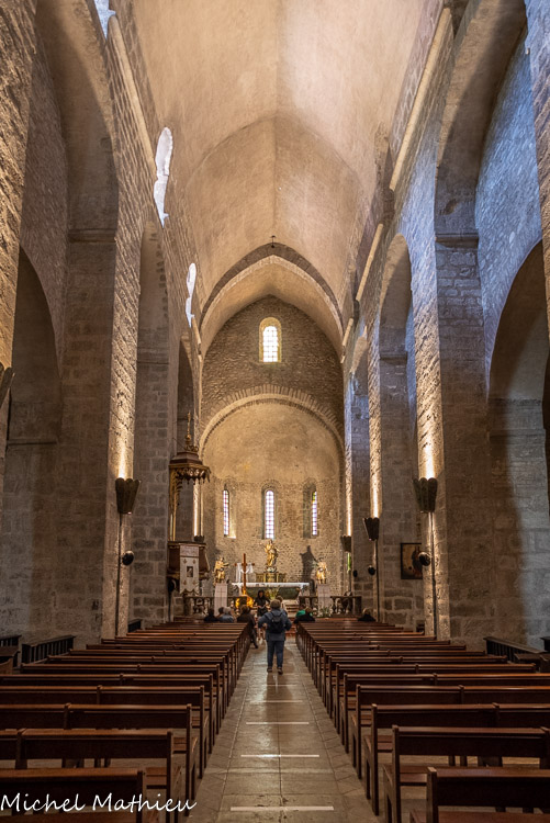 Conçue comme une basilique antique, l'église est structurée par une grande nef à trois vaisseaux et son chœur principal est placé à l'ouest. La disposition du chœur, courante dans les édifices carolingiens des régions nordiques, est unique dans la région. Cette « tradition » s’expliquerait par la survivance de pratiques liturgiques spécifiques au haut Moyen Âge. Les trois nefs à l’origine charpentées ont dû recevoir le voûtement actuel en 1157, date de la nouvelle consécration de l’édifice. La nef centrale est couverte en berceau brisé. tandis que les collatéraux sont couverts en plein cintre. Les piliers de support doublent le premier mur du XIe siècle. Comme dans toutes les églises de type basilical, des fenêtres hautes éclairent la nef centrale. Les piliers de support doublent le premier mur du XIe siècle. Comme dans toutes les églises de type basilical, des fenêtres hautes éclairent la nef centrale.