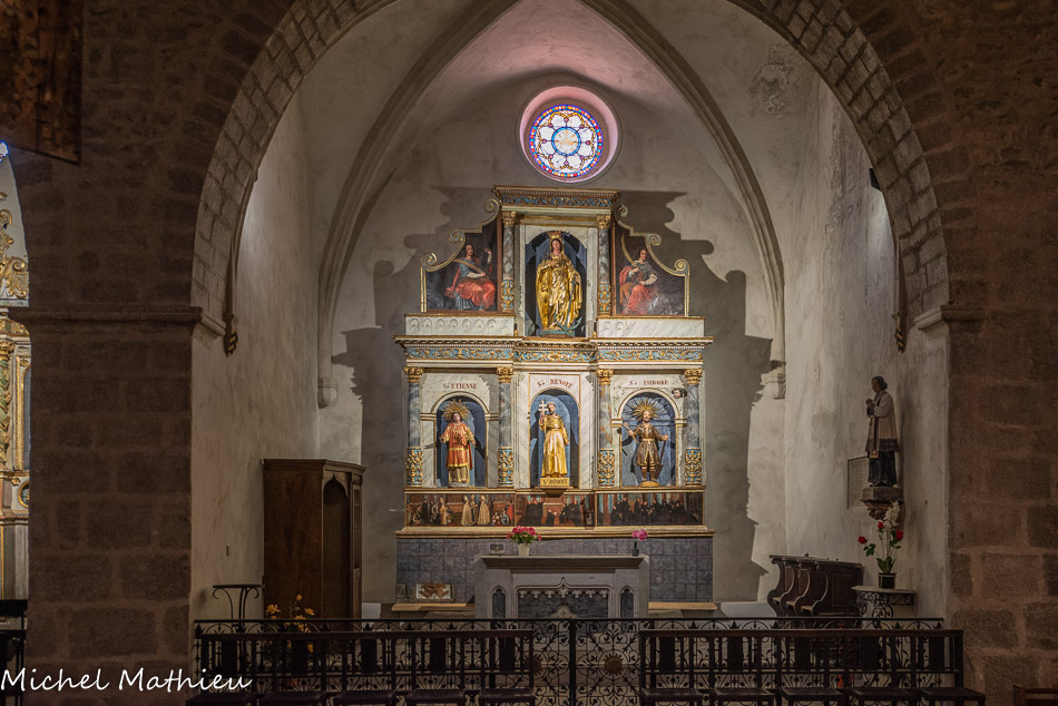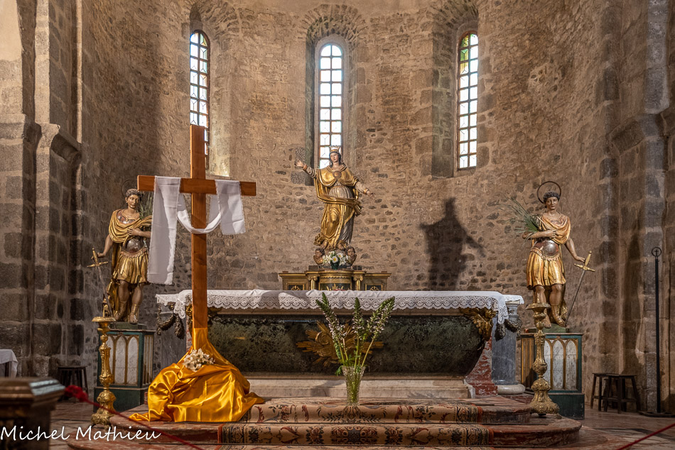 Le chœur de l’église est composé d’une abside et de deux absidioles. L'abside. La statue de la Vierge est encadrée par celles d'Abdon et Sennen.
