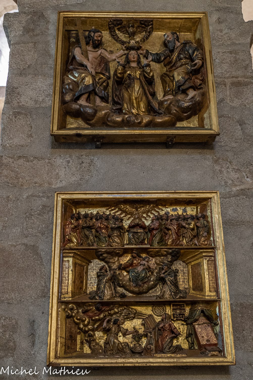Deux des six panneaux du retable du Rosaire (1670). Couronnement de la Vierge. En bas, l'Annonciation, l'adoration des Mages, la Pentecôte.