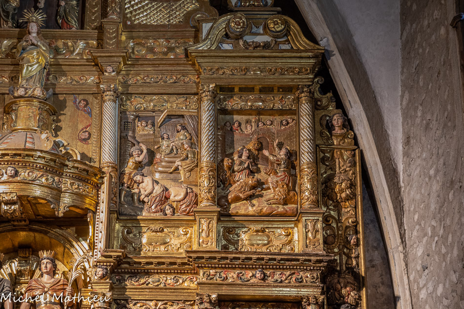 La chapelle des Sts Abdon et Sennen. Retable pré-baroque daté de 1647, œuvre de Lazare Trémullas, premier introducteur en Roussillon du grand retable à panneaux sculptés dorés et polychromés couvrant entièrement le mur du fond de chapelle.