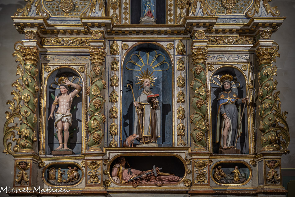 Saint Antoine, ermite, avec le cochon, entouré des saints guérisseurs, saint Sébastien et saint Roch. La prédelle à niches oblongues est intéressante, notamment pour celle du centre qui abrite une statue de sainte Madeleine couchée.