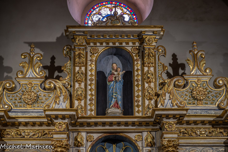 Au couronnement du retable, une Vierge est de facture récente. Elle tient une ancre, symbole de l'Espérance.Aux ailerons du retable, deux toiles peintes figurent à droite sainte Quitterie et à gauche sainte Afra. Ce sont deux martyres du IVe siècle, originaires de Galice pour la première et de Gérone pour la seconde.