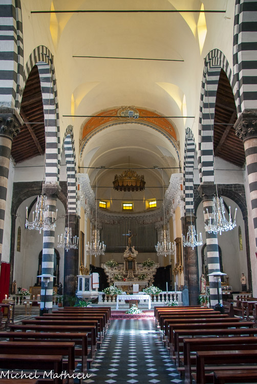 Un plan basilical à trois nefs, comme les églises de Vernazza et Corniglia présente un rétrécissement progressif de la largeur des nefs vers l’entrée, avec le double effet de créer une illusion de perspective et de favoriser la propagation des ondes sonores.