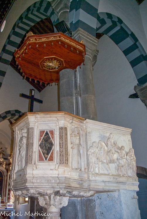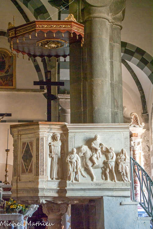 Basilique de San Giovanni Battista. La chaire de 1530 avec bas-relief représentant San Martino est de belle facture.