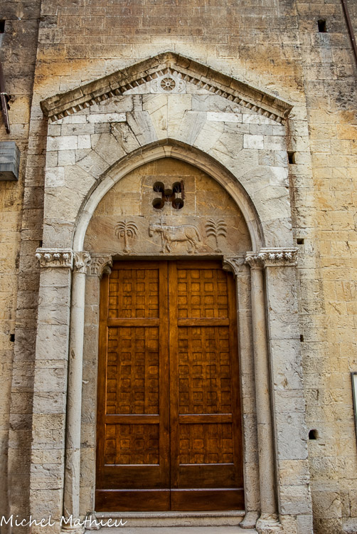 Portail de 1300, la roue symbole de l’éternité, le palmier, symbole de Sanremo, le saint agneau au centre.