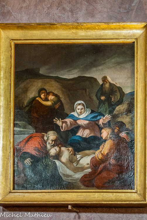 Peinture à l'huile sur toile, qui représente le tombeau de la Ste Vierge visitée par les Apôtres, oeuvre de Giacomo Boni, entourée des statues de Maragliano représentant St Jean Evangéliste et Ste Elisabeth, achevées en 1737.