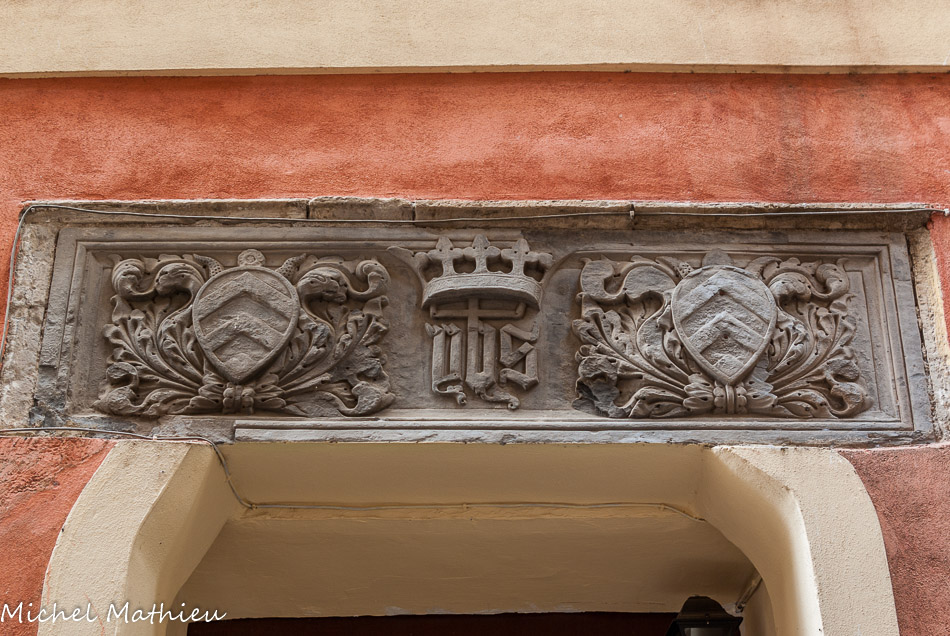 Dessus de porte gravé en ardoise, du moyen age. A droite et à gauche, armoiries de la famille qui habitait la maison. Au centre la couronne qui protège la maison du diable, avec les lettres IHS : Jésus sauveur des hommes.