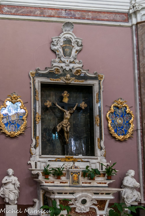 Dans le transept de gauche voici un autel en marbre polychrome qui date de 1723. Dans cette même année Mons. Gaetano Soleri y fit placer la statue en bois du Christ Crucifié en agonie, d’Antonio Maria Maragliano.