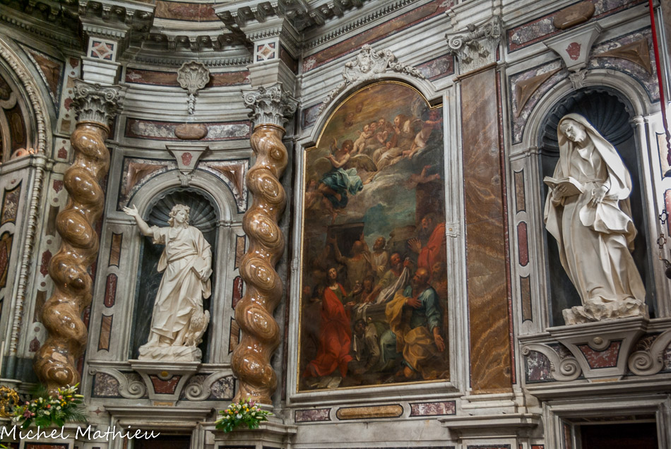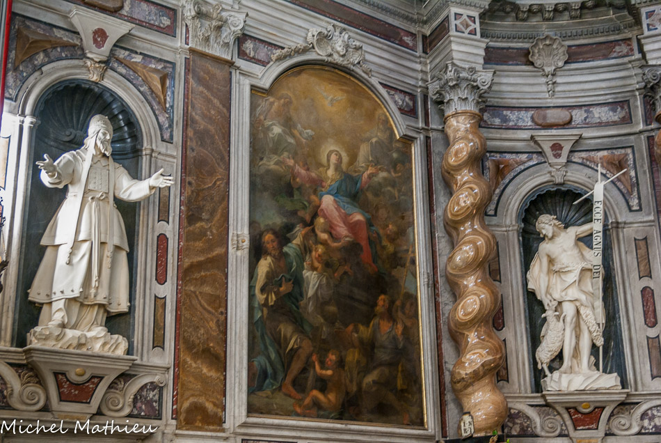 Toile qui représente la Ste Vierge et les Apôtres Jacques et Philippe, oeuvre de la fin du XVII siècle du peintre romain Antonio Odazi, entourée des statues de Maragliano représentant St Jean Baptiste au fond et le prophète Zacharie, achevées en 1737.