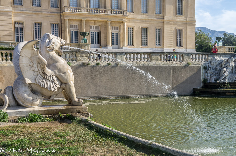 Le « bassin de France » est orné de deux griffons et d'une sculpture rappelant la participation de la famille Borély dans le creusement du canal de Suez.