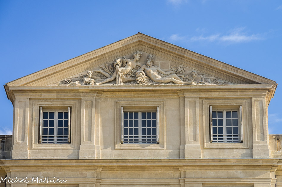 Peyre donna plus d'élégande à l'édifice en le surélevant au moyen d'un attique percé de trois fenêtres sur chaque façade et flanqué de mansardes. Le fronton de Clérisseau est orné des allégories du Rhône et de la Durance.