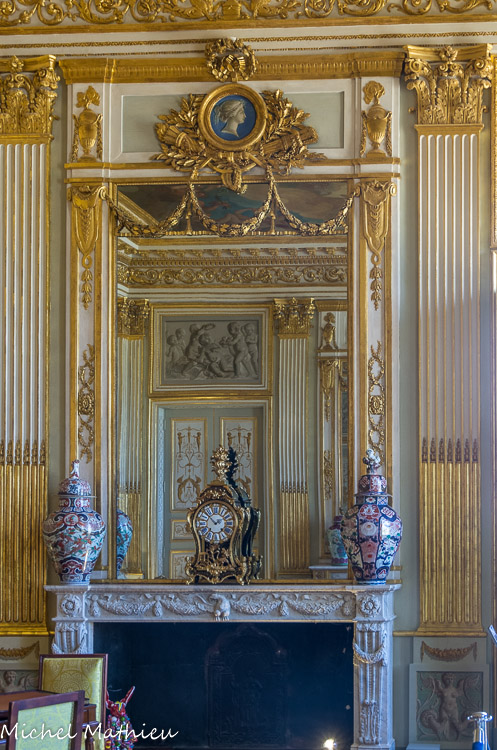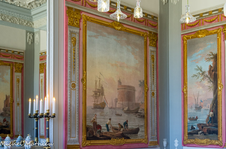 Son sol de tommettes, assez inattendu au regard de la somptuosité du décor environnant, gardaitr la fraîcheur. Table de trictrac qui n'est pas d'origine. Elle est attribuée au célèbre ébéniste Leleu, ébéniste au service du roi. Ses pieds droits, son caractère dépouillé en font un bon exemple du style Louis XVI.