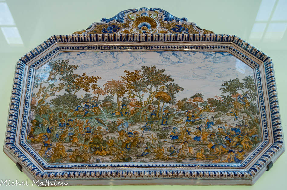 Fontaine d'applique, le char d'Amphitrite, fabrique Honoré Savy. Faïence, décor de grand feu polychrome. Vers 17656-1770.