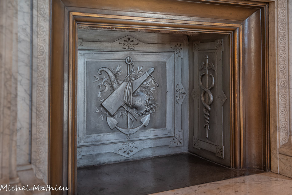 La cheminée monumentale en marbre ornée d'une statue du génie de la France fut sculptée par le Parisien Germain Gilbert en 1877.