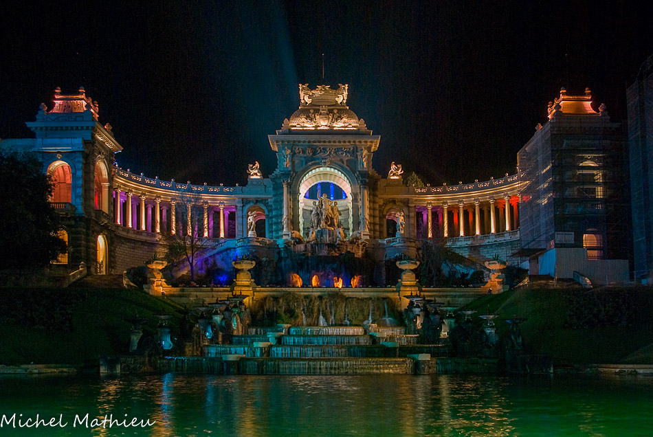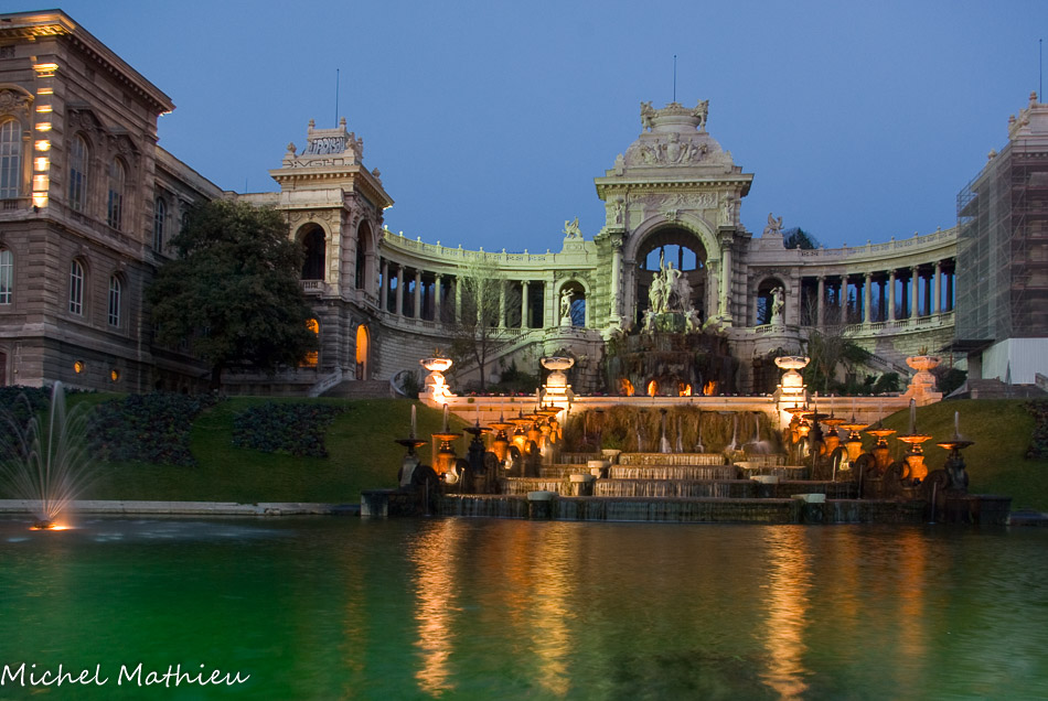 L'ensemble, construit de 1862 à1869, est un hymne à l'eau source de vie : elle jaillit du pavillon central, flanqué de colonnades. Il est composé de trois entités : au centre un château d'eau édifié pour la commémoration de l'arrivée à Marseille des eaux de la Durance de part et d'autre duquel se trouvent reliés par une colonnade semi circulaire le musée des beaux-arts et le Muséum d'histoire naturelle.