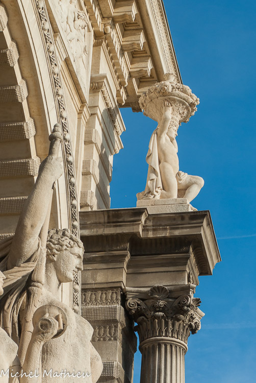 Pour le musée des Beaux-Arts, " Minerve entourée de génies des arts". Les noms pour le musée des Beaux-Arts : Mansart, Coustou, Vien, David, Bramante, Léonard de Vinci, Michel-Ange, Titien, Raphaël, J. Goujon, J. Cousin, Philibert Delorme, Vélasquez, Rubens, Phidias, Ictinus, Scopas et Appelles. Des médaillons ornés de symboles ponctuent les fenêtres des deux musées : ici, des instruments pour les différents arts.